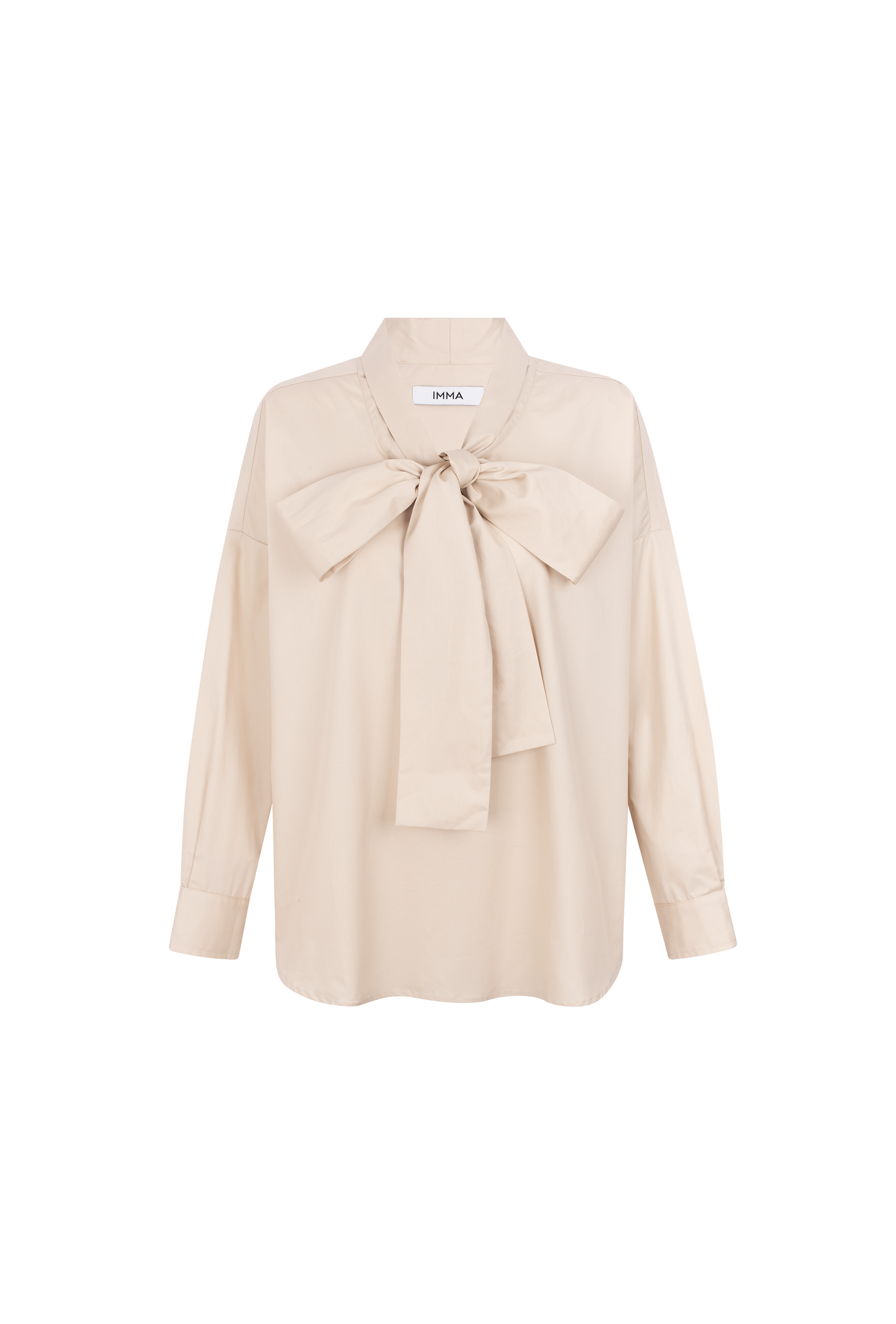 This shirt reinterprets a timeless classic with an oversized bow detail that feels effortless yet defined. Crafted in soft beige cotton poplin, its fluid shape and sculptural neckline bring a touch of modern femininity to IMMA’s minimal codes.