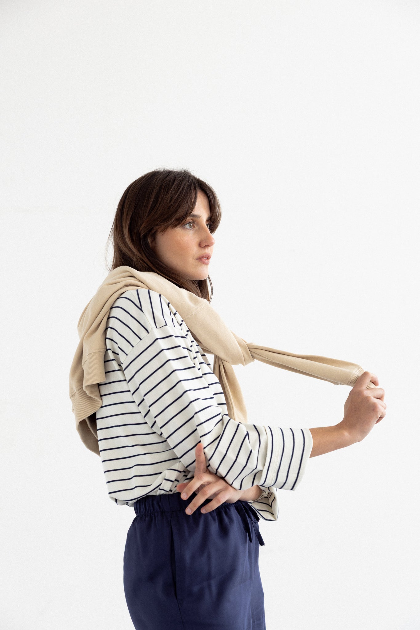 Crafted from 100% lightweight cotton jersey in a specialized Portuguese factory, the JANE Breton Shirt is light, soft, and comfortable. It adapts effortlessly to your style—whether tucked, half-tucked, or untucked—and offers year-round versatility.
