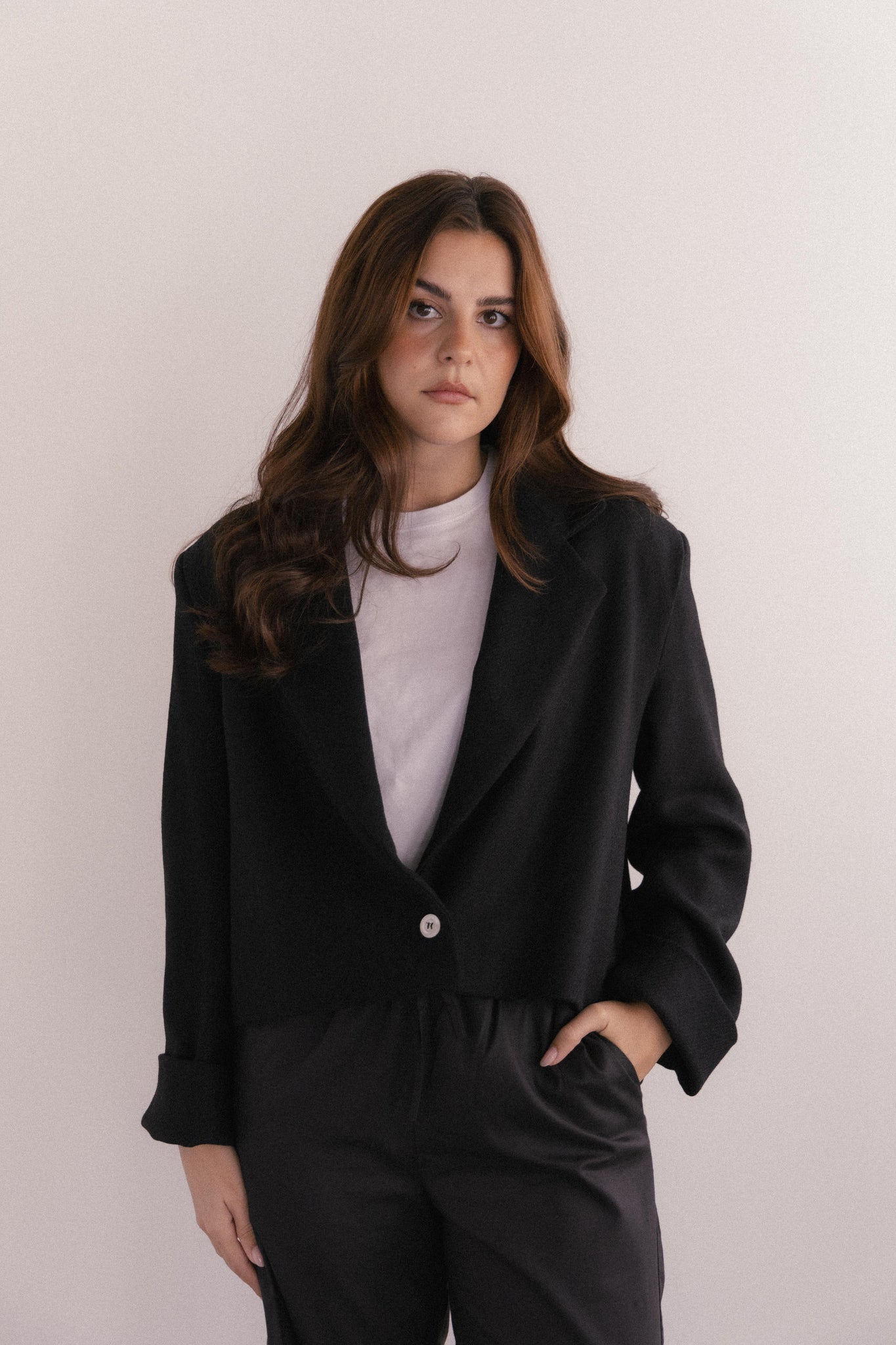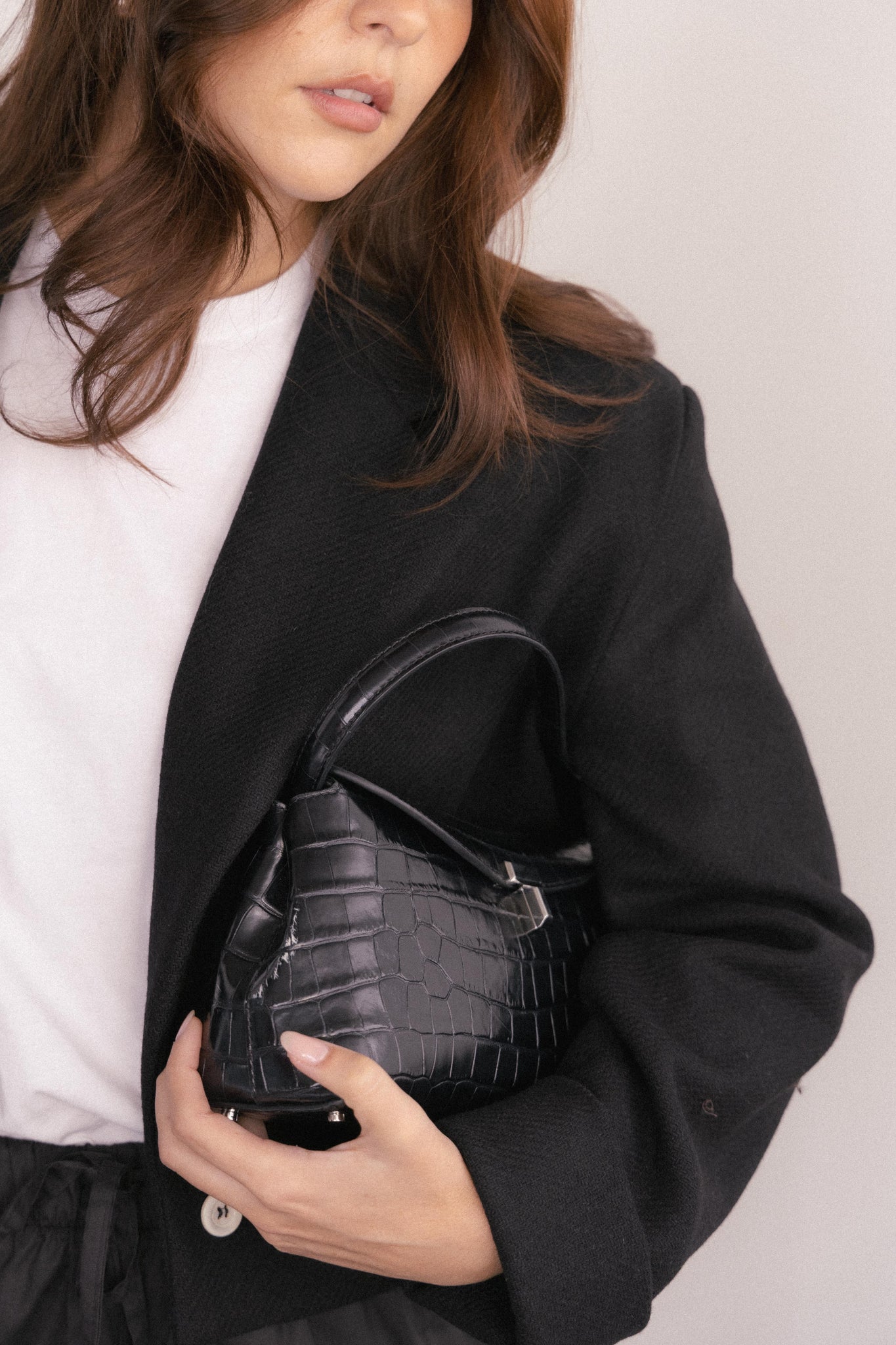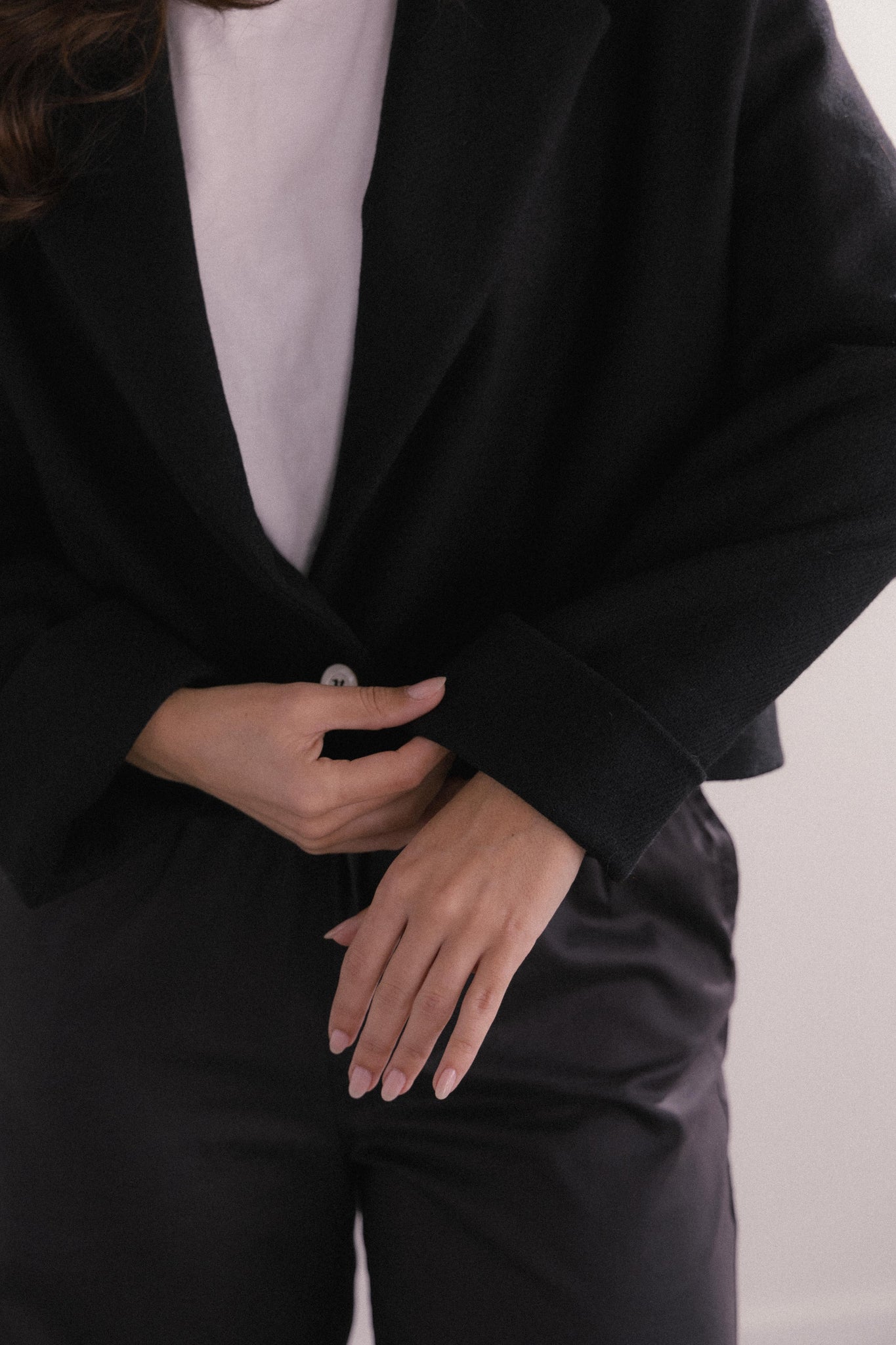 Totalmente forrada para maior conforto e durabilidade, fecha com um único botão de madrepérola, um detalhe subtil que confere leveza e uma elegância discreta.